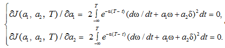 Коэффициент затухания экспоненты α характеризует интервал осреднения квадрата невязки е2(t) и может быть подобран экспериментально. В дальнейшем будем предполагать, что процесс рыскания буксируемого судна наблюдается достаточно долго, чтобы принять нижний предел в критерии равным –∞. Таким образом, чтобы стабилизировать и минимизировать рыскание буксируемого судна, критерий задается так: