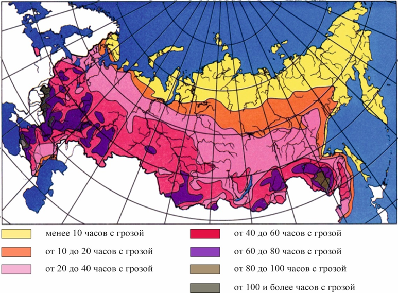 На берегу моря наблюдается частая смена погоды из-за испаряющейся воды и образование грозовых скоплений с разрядами молний. Грозовая деятельность на территории России увеличивается от севера к югу (рис. 1) и выражается в количестве часов активности за год [1].