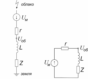 Рис. 3. Эквивалентные расчетные схемы для определения напряжения (а) и тока (б) молнии в месте удара молнии