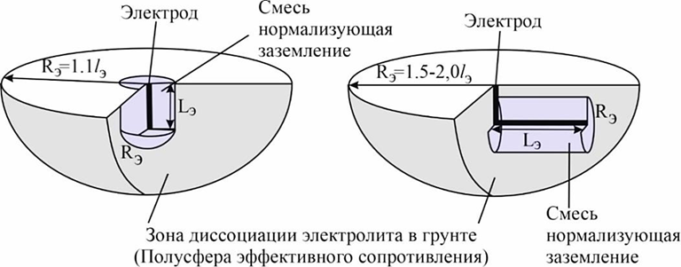 Рис. 8. Схема электролитического заземления в грунте и зона эффективного сопротивления