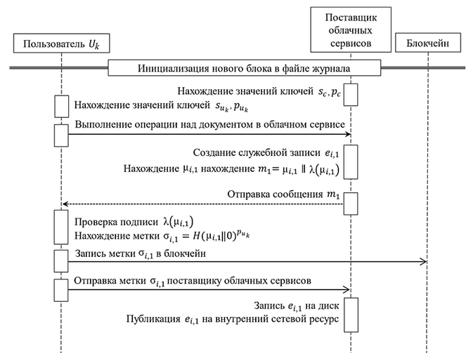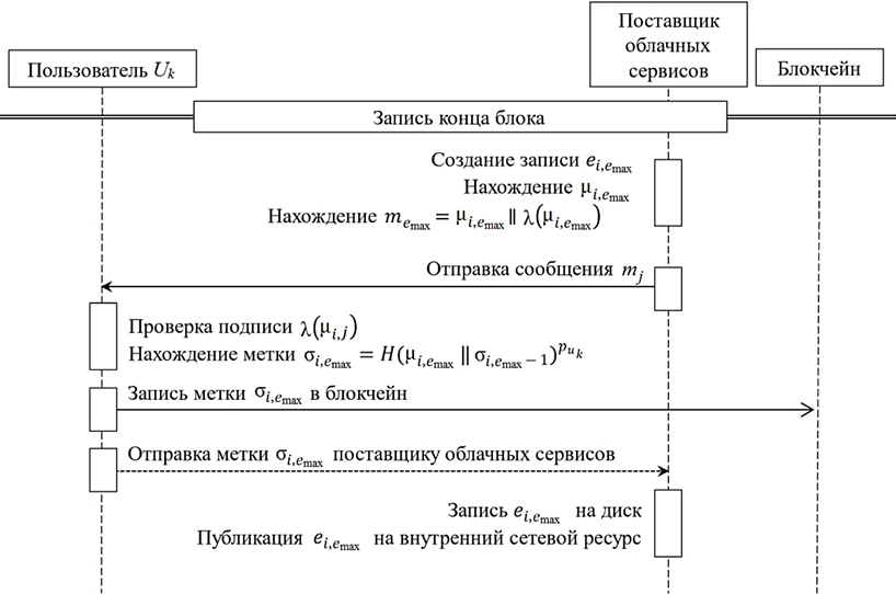 записывается в блокчейн и отправляется поставщику облачных сервисов. После получения метки поставщик облачных сервисов создает и записывает на диск