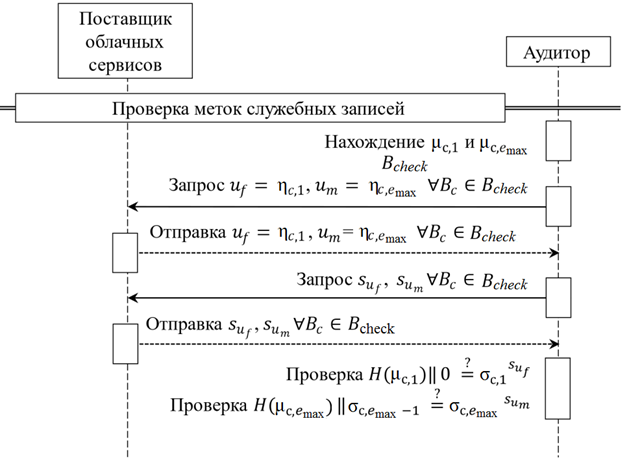 Получив сообщение m, аудитор проверяет подпись и в случае успешной проверки восстанавливает из φ значения меток записей. Для каждого блока