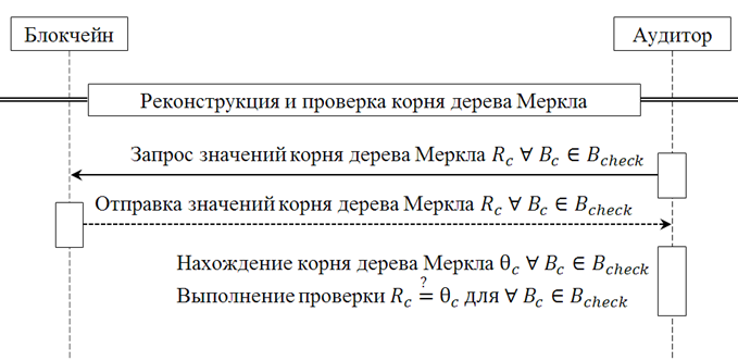 В случае успешной проверки согласно условиям (5), (6) для каждого аудитор запрашивает из блокчейна значение корня дерева Меркла Rc [4–6]. Далее для каждого Bc аудитор выполняет следующие действия:
