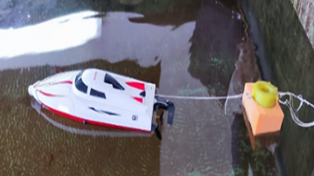 The last stage is performed as follows. We lower the ship model on the water. Securely fix a measuring tape (we used a geodetic tape measure) from the beginning of the test model to the end of the pool. Two homemade buoys from bottles with a weight on the end of the rope mark certain distances on the water, but in such a way that the model does not touch them during the stroke. Connect the FA, which should also not touch the buoys during movement. Immerse the floating anchor in the water, but do not release its pull so that the anchor is not under the model and does not touch the propeller. At the same time, let go of the luff, turn the model on to maximum power and start the stopwatch. Use the stopwatch to measure the distances marked by the buoys. Knowing the path and time, we find the speed of the test model with the towed floating anchor. Do the same experiments with each FA.
