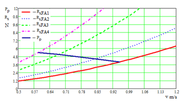 Fig. 10. Graph of the resistance of FA Rx = f (v) and disposable thrust graphs Pp = f (v), Pp1 = f (v)