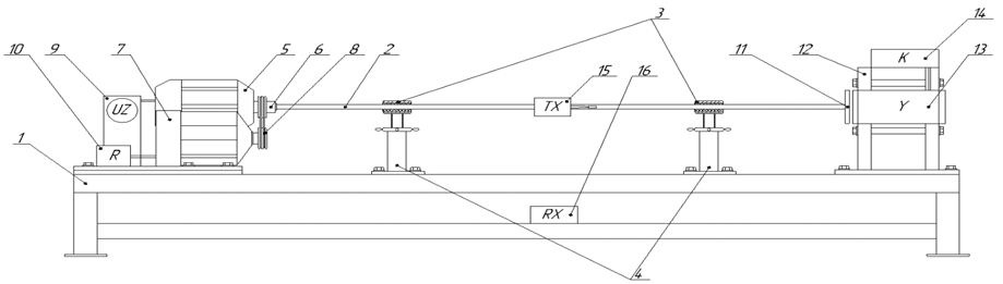 1 – metal frame; 2 – shaft; 3 – plain bearings; 4 – stands; 5 – asynchronous motor; 6 – sleeve coupling;