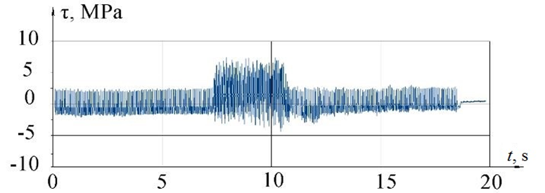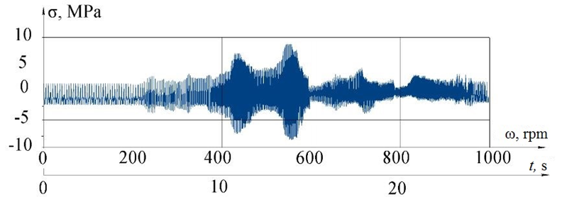 Torsional vibrations of the shaft line were simulated by activating a load generator while the shaft rotated at a constant frequency of 50 rpm. The oscillation strain gauge recorded a region of dynamic instability between the 7-th and 12-th seconds of operation. Torsional vibration stresses did not exceed 5 MPa.