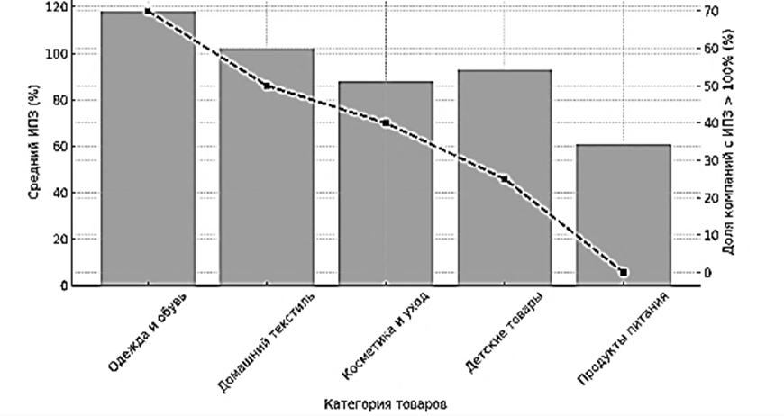 На рисунке представлены данные по категориям, столбцы серого цвета означают средний уровень ИПЗ, пунктирная линия – долю компаний с критическим уровнем зависимости. Наивысший уровень платформенной зависимости зафиксирован в категории одежды и обуви – 70 % предприятий имеют ИПЗ выше 100 %. Категория продуктов питания показала наименьший уровень зависимости, ее ИПЗ = 61 %, при этом доля компаний с критической нагрузкой равна 0 %. Компании с диверсифицированными каналами сбыта демонстрировали существенно меньшую зависимость от маркетплейсов.