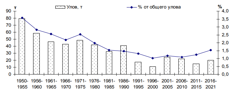 Официальная статистика на протяжении ряда лет демонстрирует снижение уловов судака. Динамику и объемы его вылова за последние 70 лет можно разделить на два основных этапа: годы государственного лова (до 1990-х гг.) и период социально-экономических преобразований 1990-х гг. с переходом управления рыбной отраслью в частные руки. В 1950-х гг. уловы судака составляли в среднем 74 т, в 1960-х гг. – 46 т, в 1970-х гг. – 44 т, в 1980-х гг. – 30 т, в 1990-х гг. – 10 т.