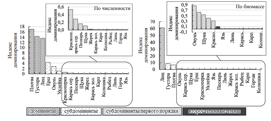Во второй фазе единственным доминантным и по численности, и по биомассе видом стала густера. Лещ и плотва перешли в группу субдоминантных по численности видов, сюда же добавился и ерш. По биомассе в данную группу, помимо леща и плотвы, также вошли окунь и красноперка (рис. 4).