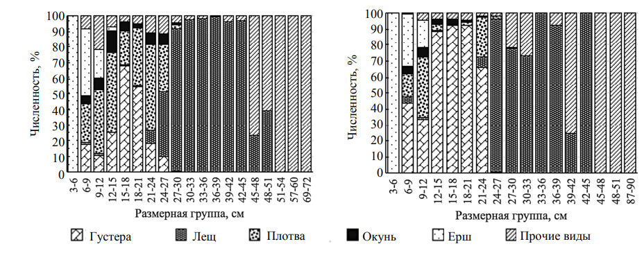 Анализ размерно-видовой структуры, полученной по данным контрольных обловов по каждой из двух выделенных фаз, показал, что основные различия в видовой структуре наблюдаются в размерных группах от 6 до 30 см. При этом особи с размерами до 6 см были представлены только ершом, от 27 до 45 см – в большинстве своем лещом, более 45 см – исключительно щукой. В первой фазе в размерных классах 12–15 и 21–24 см преобладала плотва, в то время как густера по численности доминировала лишь в размерных группах 15–21 см. Во второй фазе густера в большинстве своем была представлена размерами рыб от 12 до 24 см, доля плотвы по сравнению с первой фазой, наоборот, снизилась: в размерных группах 9–12 и 21–24 см она являлась вторым по численности видом (рис. 5).