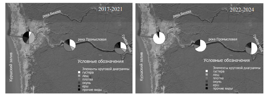 The study is devoted to the assessment of the role of Cyprinid fish (gaster, bream, etc. species) in the formation of a spawning herd and the structure of the ichthyocenosis of the Promyslovaya River (Kaliningrad region), one of the key watercourses of the Curonian Lagoon basin of the Baltic Sea. Based on six years of monitoring (2017, 2018, 2021-2024) using the NetCor sonar system and control fishing nets, the transformation of the fishing community was revealed, divided into two phases. In the period 2017-2021, bream, bream and roach were mined, but in 2022-2024. Galera has become an absolute dominant (76% of the population, 75% of the biomass). The increase in its share is associated with a decrease in the number of bream due to the bar at the mouth, which restricts its migration. The Palia–Kownatski Index confirmed the transformation of the community: In the second phase, gaster prevailed in all sections of the river, including spawning grounds. Spatial analysis showed a decrease in the proportion of gaster from the mouth (89%) to the upper reaches (50%), and temporal distribution revealed a prolonged spawning season of this species (April–June). In 2024, a general decrease in the number of fish was recorded, probably due to land reclamation work to clean the riverbed, which affected the hydrological regime and the food supply of this river. The comparison of hydroacoustics data and net catches confirmed a high correlation of methods and the effectiveness of hydroacoustics in the conditions of small rivers in the Kaliningrad region. The work highlights the key role of the gustera in maintaining the stability of the ichthyocene under anthropogenic impact and the need to take such species into account when managing the aquatic ecosystems of the Baltic Sea basin.