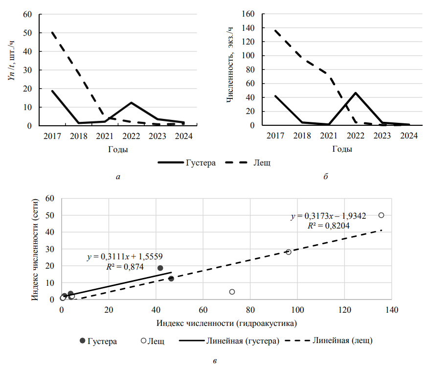 Результаты показали снижение численности леща в р. Промысловой с 2017 г., когда наблюда-лись максимальные значения индекса численности. В 2022 г. отмечается увеличение численности густеры в реке после некоторого ее снижения в 2018 и 2021 гг. Однако к 2024 г. отмечается общая тенденция к снижению численности рыб. Как видно, данные сетных уловов и акустики дают сходную динамику индексов численности (коэффициент линейной корреляции Пирсона (p = 0,05) составляет 0,93 для густеры и 0,91 для леща), что позволяет говорить о сходстве оценок двух методов и высо-кой степени достоверности получаемой средствами гидроакустики информации.