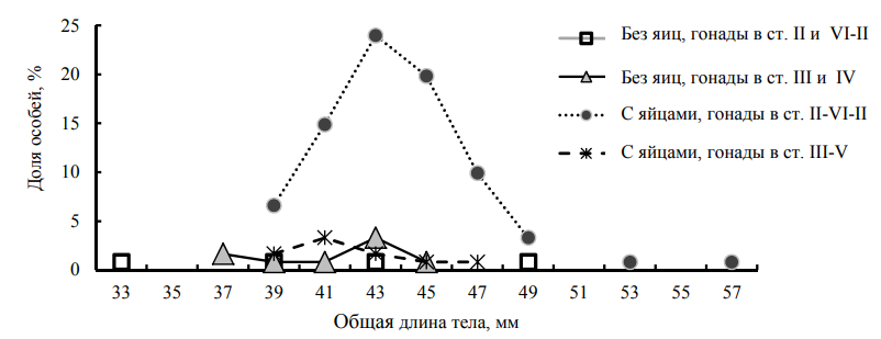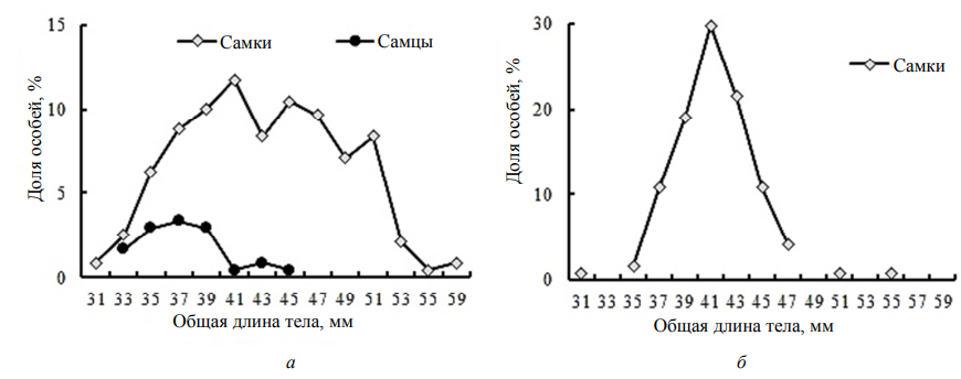 В мае 2017 г. максимальные размеры самок были чуть меньше, средние размеры сравнимы с таковыми в сентябре 2016 г. (см. табл. 1); унимодальная кривая размерного состава самок показала доминирование особей с модальным размером ДТ 41 мм, по сравнению с сентябрем отмечено уменьшение доли крупноразмерных (ДТ более 45 мм) самок (см. рис. 1).