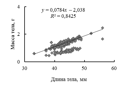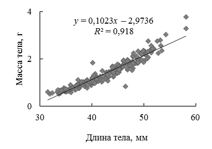 Бóльшая максимальная масса тела самок соответствовала их бóльшим (ДТ до 58,1 мм), по сравнению с самцами (до 44,1 мм), размерам тела. Изучение размерно-весовой зависимости у P. adsperus Каркинитского залива показало сильную линейную связь между параметрами длины и массы тела (рис. 2, табл. 4).