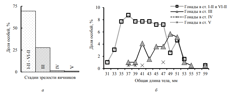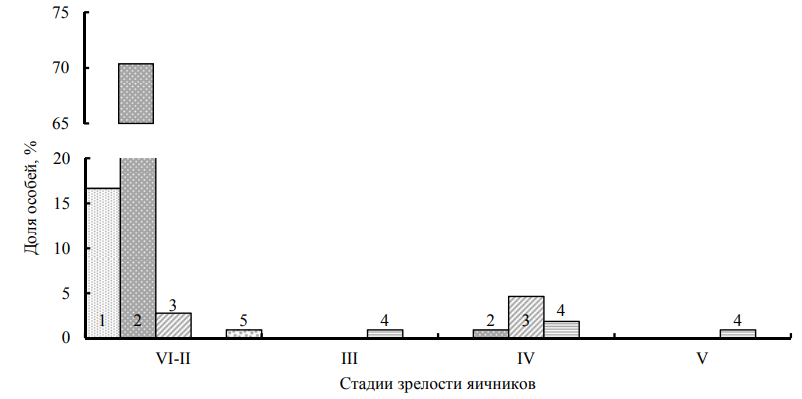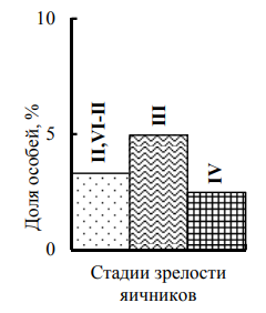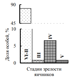 – оценку степени созревания яичников по 6-балльной шкале (стадии I и II описывают неразвитые яичники неполовозрелых и половозрелых (готовых к первому спариванию) самок, стадии III–V – гонады в начале, середине созревания и зрелые яичники соответственно, стадия VI–II – неразвитые гонады посленерестовых особей);