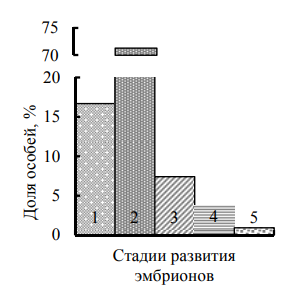 – оценку степени развития эмбрионов в яйцах на плеоподах по 5-балльной шкале по [14] (стадия 1 описывает только что отложенное яйцо, визуальных признаков развития эмбриона не наблюдается; стадия 2 – заметен зародышевый диск в форме полумесяца, желток занимает до 70 % объема яйца; стадия 3 – около 70 % яйца занято эмбрионом полулунной формы, его хвост может достигать головы и даже заворачиваться на нее, зачаток глаза в виде тонкой серповидной полоски, роговица частично пигментирована; стадия 4 – глаза эмбриона развиты достаточно хорошо, роговица пигментирована, у эмбрионов креветок с крупными яйцами различимы головогрудные придатки; стадия 5 – внутри яйца находится сформированная личинка (эмбриональный науплиус – у пенеоидных креветок; зоэа – у каридных видов, различимо разделение ее тела на головогрудь, сегментированное брюшко и слабо развитые конечности), на этой стадии на плеоподах среди яиц могут встречаться недавно вылупившиеся личинки);