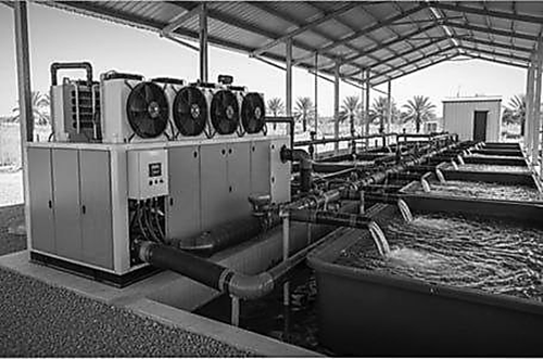 Основные параметры качества воды (температура, растворенный кислород, соленость и pH) измерялись еженедельно. Температура воды во время исследований варьировала в пределах 25–28 °C, содержание кислорода поддерживалось в пределах 6,5 мг/л, показатель рН – 7,8. Для поддержания температуры воды в оптимальном для радужной форели диапазоне (12–16 °C) в условиях жаркого климата Ирака использовались промышленные системы охлаждения (чиллеры) (рис. 1) и затеняющие сетки над садками для уменьшения воздействия прямых солнечных лучей (рис. 2).