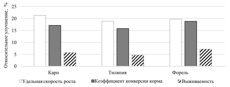 Детальный анализ табл. 7 выявляет тенденцию к улучшению всех показателей у всех видов при использовании пробиотика. У карпа наблюдается наилучшая реакция с точки зрения ускорения роста, зафиксированы наибольшее относительное увеличение удельной скорости роста (+21,3 %) и наилучшее улучшение коэффициента конверсии корма (–17,1 %). С другой стороны, форель продемонстрировала наивысшую реакцию в части улучшения состояния здоровья, показав наибольшее увеличение выживаемости (+7,2 %). Тиляпия показала сбалансированный ответ по всем показателям. Эти различия могут быть связаны с особенностями пищеварительной системы и физиологии каждого вида (рис. 6).