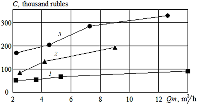 ния [6–8] позволили разработать метод оценки энергетической эффективности ОВН, который может быть применен и к другим объемным насосам. Ранее было показано экспериментально [9] и теоретически [10], что коловратный насос (КН) позволяет наилучшим образом сохранить структуру фарша при достаточно высоких показателях энергетической эффективности. Однако стоимость КН из-за особенностей конструкции выше других насосов. На рис. 1 показана стоимость объемных пищевых насосов при сопоставимых максимальных подачах Qm по прайс-листам каталога Zenova [11] на 01.12.2024.