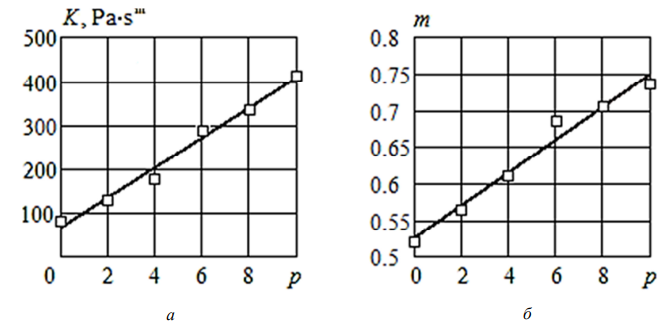 a – liquid consistency coefficient; б – stability index.