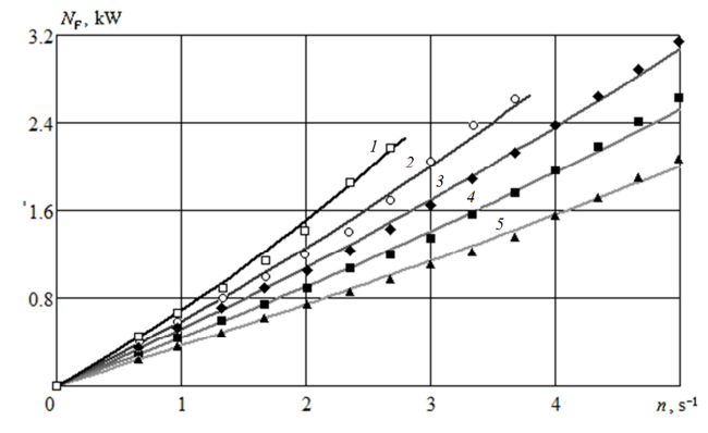 Однако непосредственно воспользоваться графиками на рис. 5 для определения энергетических затрат КН можно только при перекачивании ньютоновских жидкостей, на которых проводились испытания. Действительно, рассмотрим любую линию на рис. 5, например, 1. С увеличением ЧВР при постоянном значении БКДВ затраченная мощность растет. Но у неньютоновской среды, какой и является ПРФД, эффективная вязкость будет меняться при изменении ЧВР. Чтобы учесть реологические свойства ПРФД, заменим в формуле (2) третий компонент уравнения, отвечающий за расчет мощности вязкостного сопротивления NF, на выражение (5), предварительно определив БКДВ по формуле (3), после чего полная затраченная мощность КН рассчитывается как сумма гидравлической и вязкостной составляющих: N = NW + NF. По рис. 6 видно, что затраченная мощность КН растет как с увеличением ЧВР, так и БПД.
