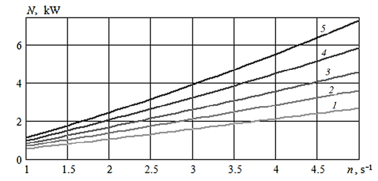 Рис. 6. Результаты расчета по формулам (2) и (5) зависимости затраченной мощности 034-WCB от ЧВР