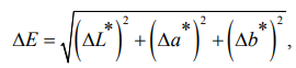 Расстояние между двумя цветами (ΔE) находили по формуле