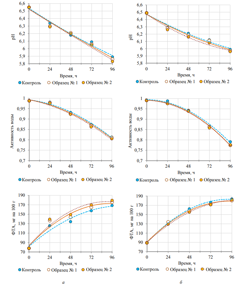 Для изучения влияния нитритной соли на физико-химические характеристики в образцах также определяли содержание формольно-титруемого азота (ФТА), активную кислотность и активность воды. Математическая обработка полученных результатов проводилась при помощи программного пакета Microsoft Office 2016.