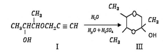 В исследовании установлено, что в условиях реакции гидратации процесс сопровождается циклизацией с образованием 2,5,6-триметил-2-окси-1,4-диоксана (III) (рис. 1).