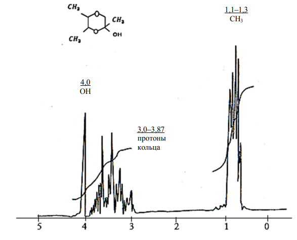 Спектр ПМР («Вариан Т-60»): СH3, 3H – 1,0; СH3, 3H – 1,1; 2-СH3, 3H – 1,2; протоны кольца, 4H – 3,87; OH, 1H – 4,0.