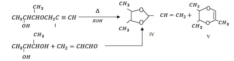 Основная каталитическая внутримолекулярная гетероциклизация. 4,5-диметил-2-винил-1,3-диоксолан (IV) и 2,5,6-триметил-1,4-диоксен (V)