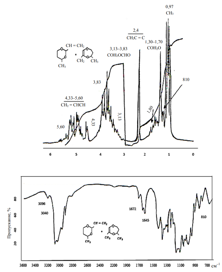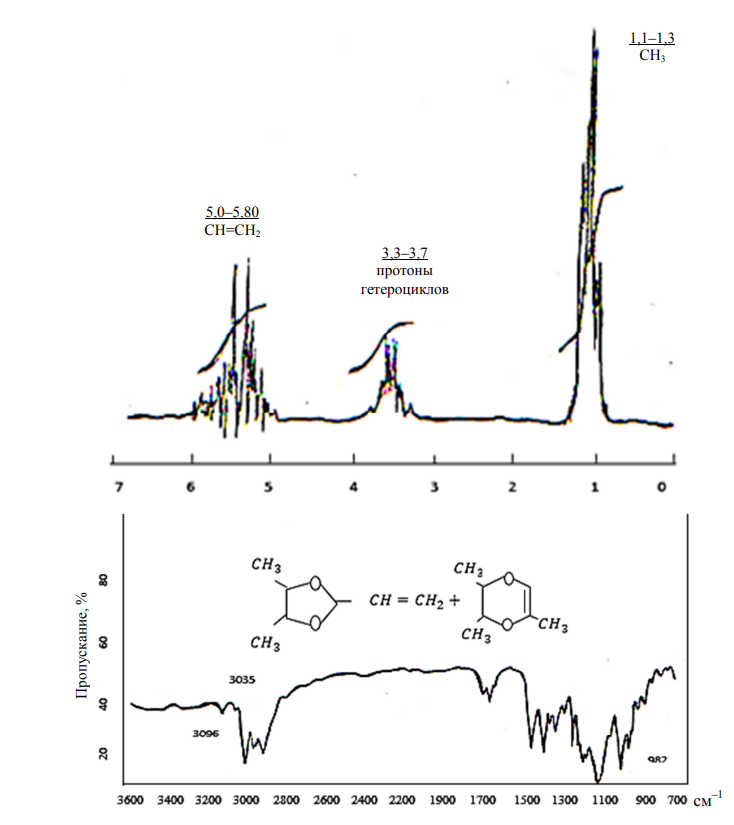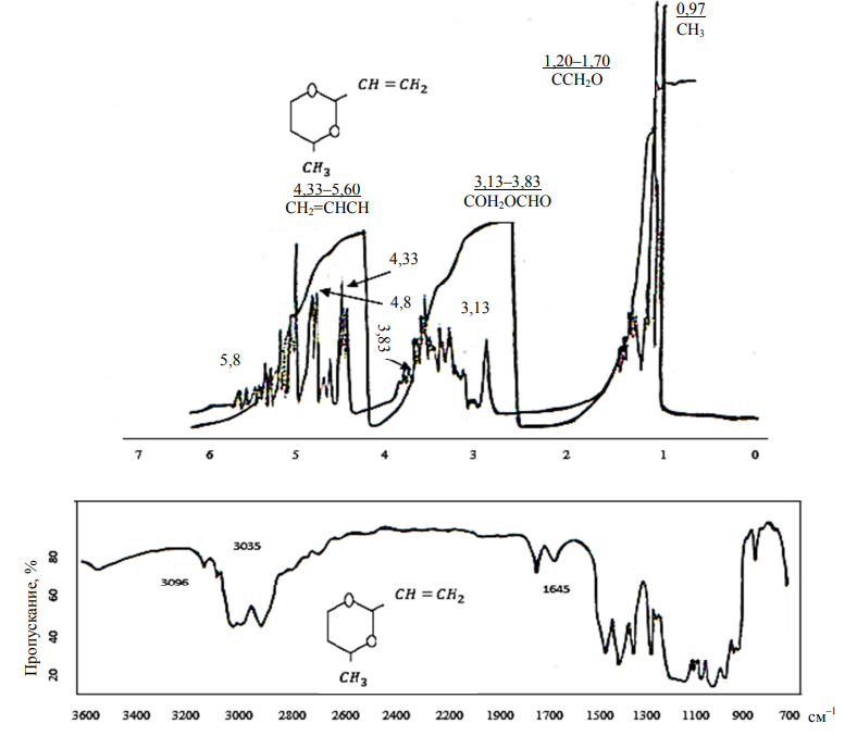 Рис. 7. Спектры ПМР и ИК-поглощения смеси гетероциклов 4-метил-2-винил-1,3-диоксана (VI)