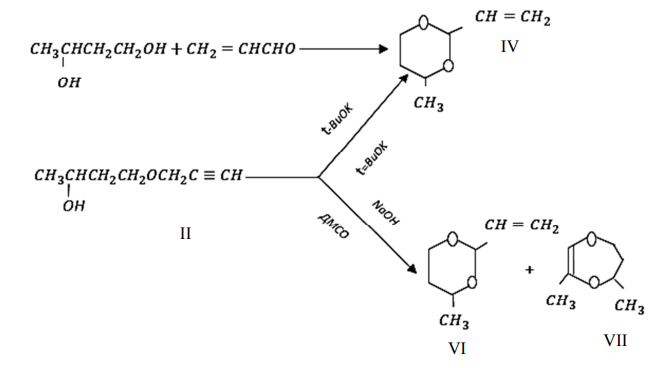 В присутствии t-ВuOK циклизация в t-BuOH протекает в сторону образования индивидуального 4-метил-2-винил-1,3-диоксана (VI), в то время как при катализе NaOH в реакции дегидрохлорирования наряду с последним образуется 3,5-диметил-1,4-тетрагидродиоксепин (VII) в количестве 12 % (по данным ГЖХ) [5–8].