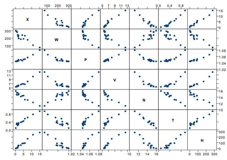 Массив исходной информации представлен рядом наблюдений, представленных семью переменными: Х – содержание примесей в смеси, %; W – скорость абсорбции, г/см3 в мин; P – плотность раствора, г/см3; V – вязкость при 25 °С, МПа·с; N – поверхностное натяжение, мН/м; Т – содержание термостабильных солей, масс. %; Н – вспенивание, мм.