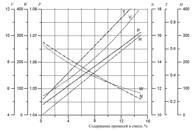 Рис. 2. График зависимости изменения параметров смеси от содержания в ней примесей