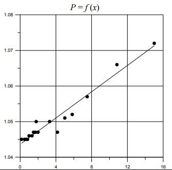 P = 0,0018 · X + 1,044 Среднее X = 3,71 Среднее P = 1,05 Остаточная сумма квадратов = 4,5E – 005 Сумма квадратов, обусловленных моделью = 0,0009 Коэффициент детерминации R2 = 0,95 |