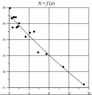 ln(N) = –0,022 · X + 2,744 или N = exp(–0,022 · X) · 15,55 Среднее X = 3,71 Среднее ln(N) = 2,66 Остаточная сумма квадратов = 0,007 Сумма квадратов, обусловленных моделью = 0,130 Коэффициент детерминации R2 = 0,95 |