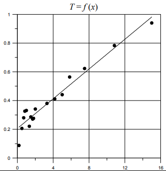 T = 0,0517 · X + 0,2059 Среднее X = 3,71 Среднее T = 0,398 Остаточная сумма квадратов = 0,041 Сумма квадратов обусловленных моделью = 0,72 Коэффициент детерминации R2 = 0,94 |