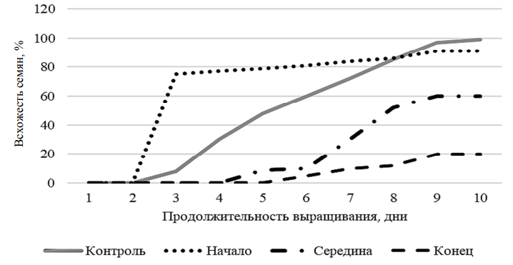Данные рис. 3 свидетельствуют о том, что первые ростки кресс-салата начали появляться уже на 2-е сутки на почве из начала нефтеям, в контроле – на 3-и сутки, на почве с середины нефтеям – на 4-е сутки и самый худший вариант был зафиксирован на почве в конце нефтеям. К окончанию периода выращивания максимальная всхожесть отмечалась в контрольном варианте почв и приближалась к 100 % (98,8 %). Близким к данному варианту был результат у опытного образца почвы в начале нефтеям, здесь всхожесть семян составила 97,5 %. Однако сама картина динамики показателя отличалась резким подъемом со 2-х на 3-и сутки с последующей стабилизацией до конца всего периода. Такой результат может быть обусловлен стимулирующим действием нефтешламов, которое по данным многочисленных исследований проявляется при загрязнении почвы нефтешламами не более 1,0 г/кг [9].