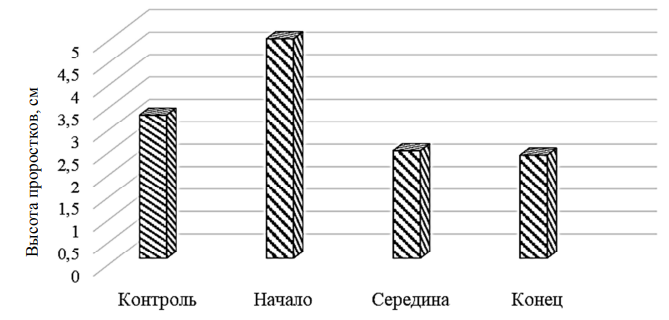 Устойчивость же растений к нефтяному загрязнению очень сильно зависит от стадии их развития и биомассы. Наиболее чувствительны к токсичному воздействию нефтепродуктов растения, находящиеся на ранних стадиях развития. Результаты измерений высоты надземной части на ранней стадии развития тест-объекта кресс-салата представлены на рис. 4.