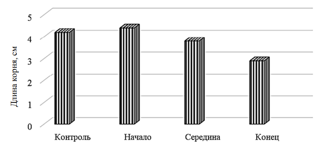 По мнению ряда отечественных авторов, длина корней является наиболее чувствительным показателем при фитотестировании [11]. В зарубежных работах данному показателю отводится ведущая роль, такой «отклик», как длина корней проростков семян, используется практически во всех работах [12]. Результаты измерений длины корней в нашем исследовании показали схожую картину с таковой по высоте проростков, однако различия по вариантам были незначительными. Лучшие показатели были отмечены на почве в начале нефтеям, где высота корней составила 4,2 см, что подтверждает стимулирующее действие углеводородов на растение при невысоком уровне загрязнения почвы нефтешламами. По мере снижения показателя далее следует контроль (4,1 см), середина (3,4 см) и конец (2,1 см) нефтеям, где отмечается замедление роста корней, подтверждающее максимальную токсичность почвы данной территории и наличия гербицидого действия нефтяного загрязнения.