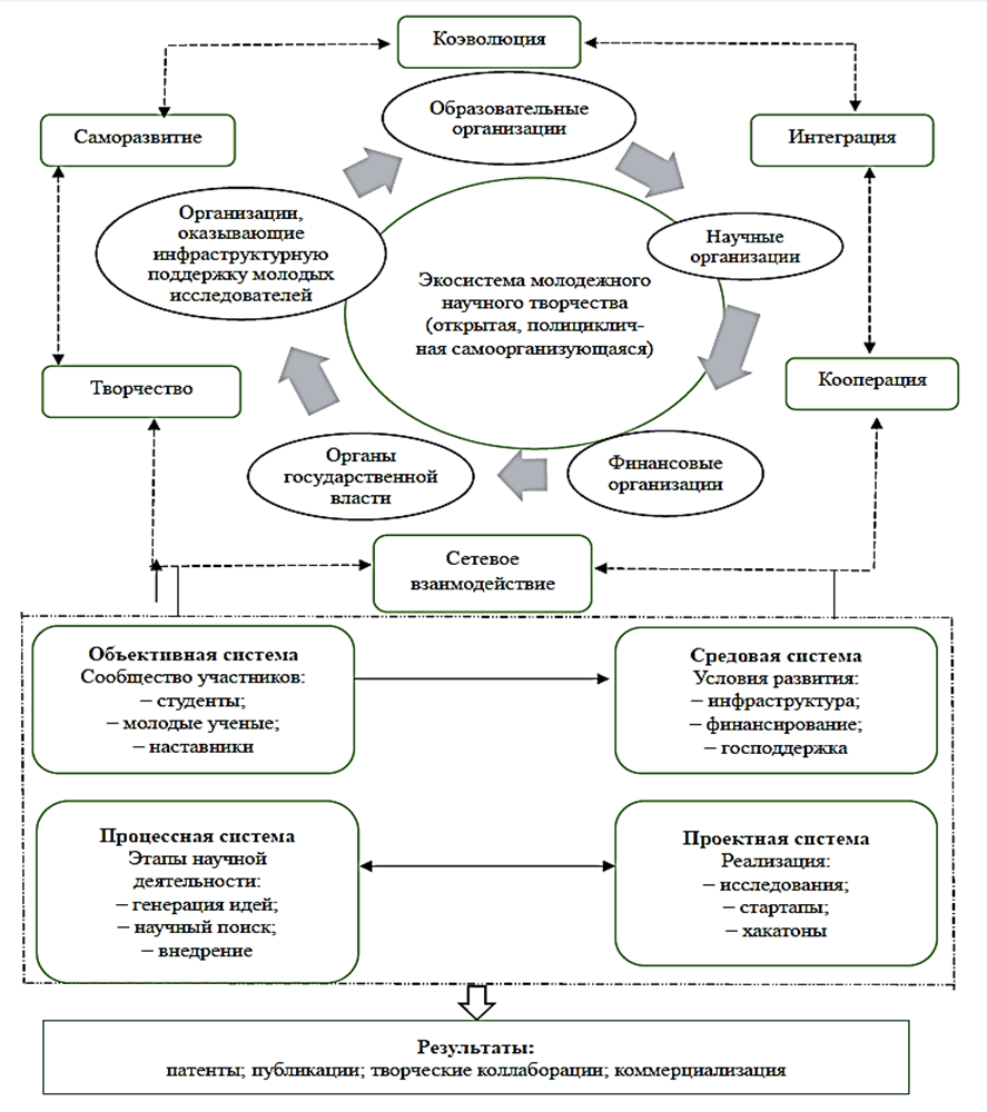 Опираясь на исследования авторов [3–5] о применении экосистемного подхода в образовательной среде, отметим, что студенческое научное творчество является частью молодежного научного творчества, которое охватывает не только образовательные организации, но и научные центры. В связи с этим в экосистему молодежного научного творчества образовательные организации должны быть интегрированы как отдельный субъект.