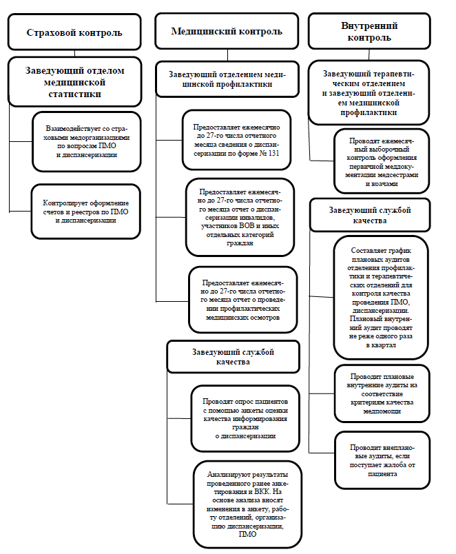 В медицинском учреждении ответственными за контроль в процессе диспансеризации являются заведующий отделом медицинской статистики, который осуществляет страховой контроль, заведующий отделением медицинской профилактики, осуществляющий медицинский и внутренний контроль, заведующий терапевтическим отделением (внутренний контроль), заведующий службой качества, ответственный за медицинский и внутренний контроль. Данную систему контроля можно считать эффективной, т. к. она учитывает интересы всех заинтересованных сторон.