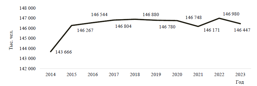 Актуальная демографическая ситуация требует поиска баланса по направлениям пространственного развития. Динамика численности населения страны представлена на рис. 1.
