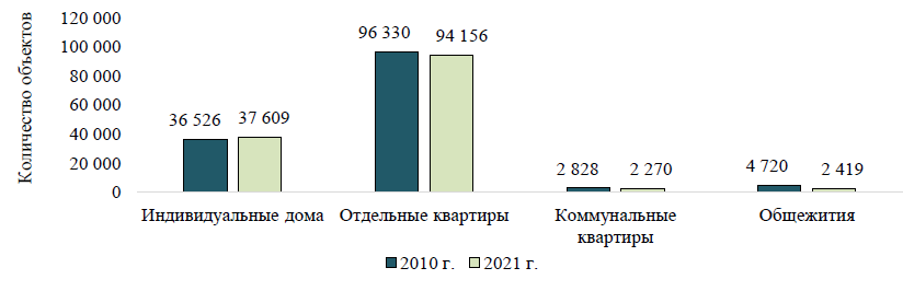 Согласно представленным данным, в период с 2010 по 2021 г. наблюдается незначительное снижение числа отдельных квартир – 94 156 в конце отчетного периода. Однако, несмотря на снижение, отдельные квартиры все же превосходят индивидуальные дома. Тем не менее намечается тренд увеличения ИЖС. Количество индивидуальных домов возросло за этот период с 36 526 до 37 609.