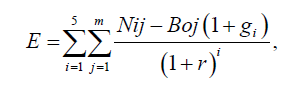 где i – порядковый номер года, имеющий значение от 1 до 5; m – количество плательщиков, воспользовавшихся льготой в i-м году; j – порядковый номер плательщика, имеющий значение от 1 до m; Nij – объем налогов, задекларированных для уплаты в консолидированный бюджет субъекта РФ j-м плательщиком в i-м году; Вoj – базовый объем налогов, задекларированных для уплаты в консолидированный бюджет субъекта РФ j-м плательщиком в базовом году; gi – номинальный темп прироста налоговых доходов консолидированных бюджетов субъектов РФ в i-м году по отношению к показателям базового года.
