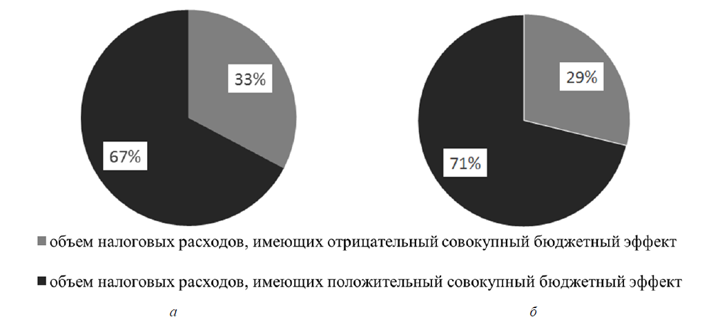 Из 89-и рассмотренных субъектов РФ отрицательный совокупный бюджетный эффект складывается у 64-х регионов [5]. На рис. 1 отображено соотношение объемов налоговых расходов с отрицательным и положительным совокупным бюджетным эффектом по налогу на прибыль и имущество организаций. Отметим, что объем налоговых поступлений, имеющих отрицательный бюджетный эффект по двум базовым видам налогов, высок, составляет 29–33 % от общего объема налоговых расходов.