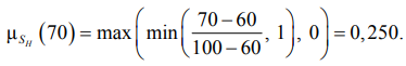 Начальным этапом является фаззификация. На этом этапе вектор четких входных значений, полученных от эксперта или систем мониторинга для конкретной анализируемой ситуации (ценность актива v0, вероятность угрозы p0, степень уязвимости s0), преобразуется в набор степеней принадлежности μ ко всем термам соответствующих лингвистических переменных. Например, для переменной S и четкого входного значения S0 = 70 процедура фаззификации заключается в вычислении значений функций принадлежности для термов SM и SH в соответствии с параметрами из табл. 1, которые имеют следующий вид: