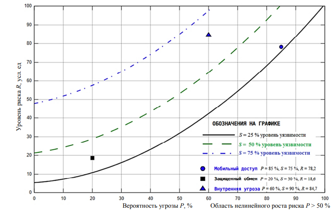 Все кривые демонстрируют нелинейный рост, особенно выраженный после пересечения порога P = 50 %, что согласуется с поведением, наблюдаемым на трехмерной поверхности. На график нанесены точки, соответствующие трем характерным сценариям, с указанием их параметров и полученного уровня риска. Данное представление позволяет сравнить сценарии между собой и оценить вклад каждого фактора: сценарий «Защищенный обмен» попадает в зону пологого роста и приемлемого риска, в то время как сценарии «Мобильный доступ» и «Внутренняя угроза» находятся в области крутого нелинейного возрастания функции, что и обуславливает их классификацию как критические.